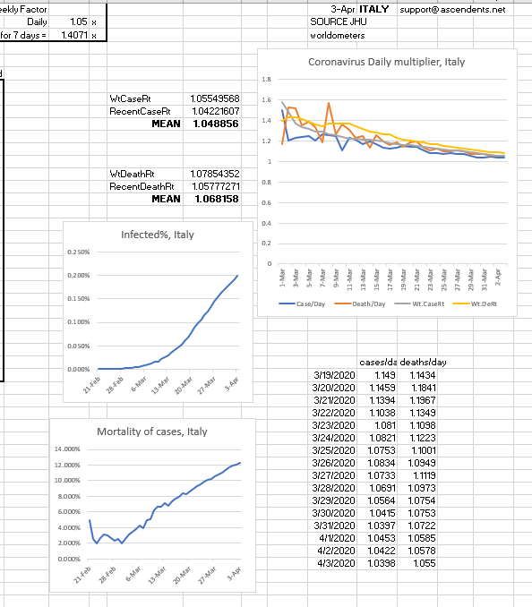 Italy appears to be gaining more control over virus' growth rate, which is now closer to 1.05.