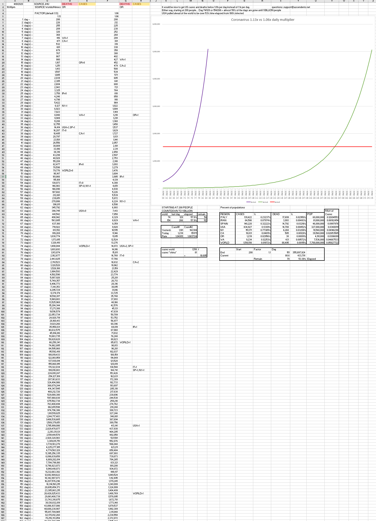 Daily growth changes daily and varies and from region to region, chart models a country's approximate placement based on an average growth rate of 1.13 or 1.06.