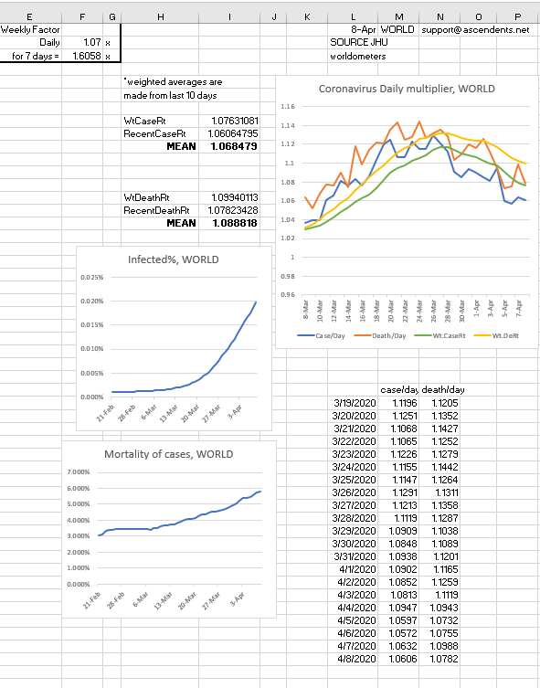 In recent days worldwide cases have been increasing by 1.1 and deaths have been increasing at around 1.13, however; even though some places reported less then 1.05 daily growrth, in past recent days many states cases have increased by close to 1.5.