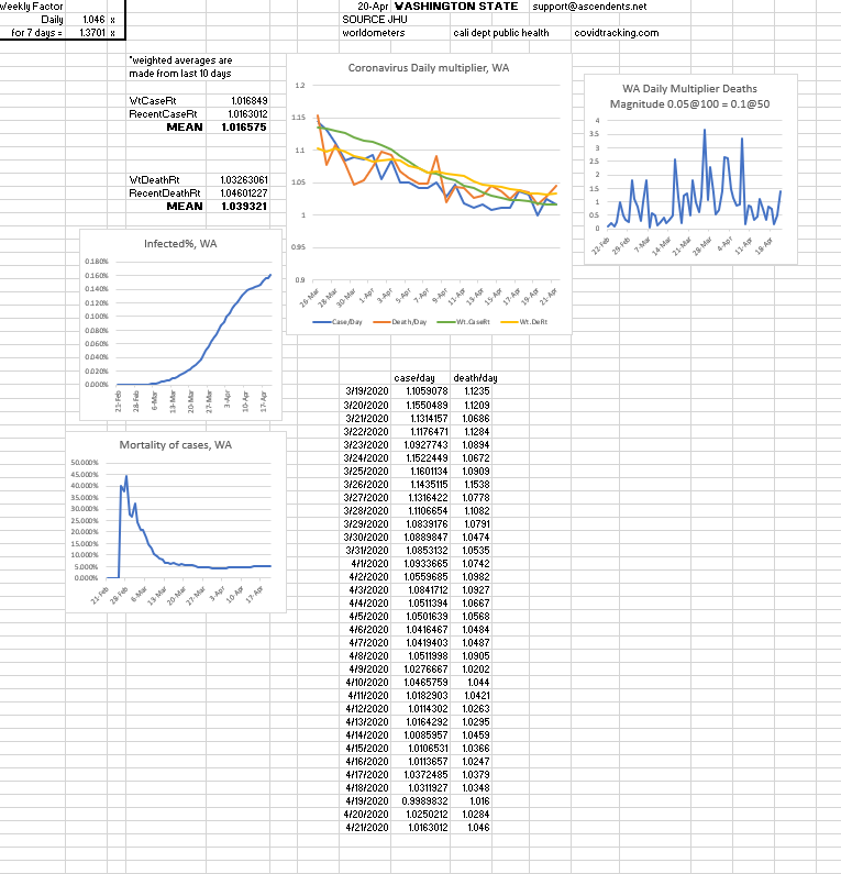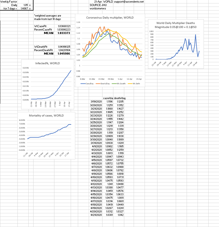 In recent days worldwide cases have been increasing by 1.05 and deaths have been increasing at around 1.08, however; even though some places reported less then 1.05 daily growrth, in past recent days some states cases have increased by close to 1.08. Oftentimes, it's around 1.1.