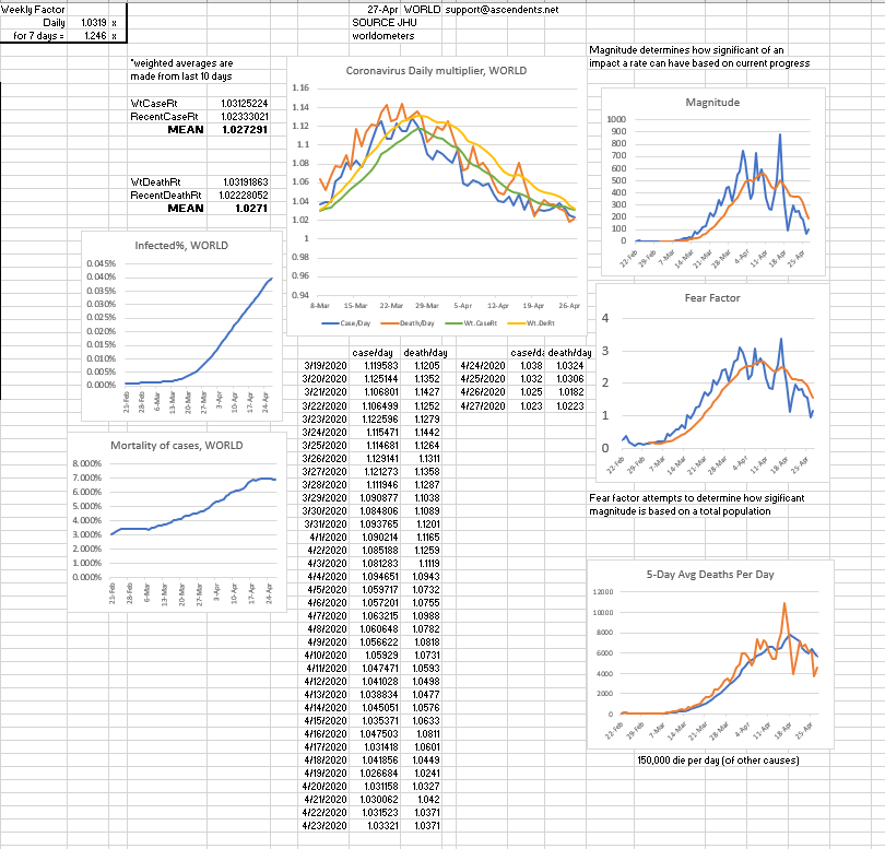 In recent days worldwide cases have been increasing by 1.05 and deaths have been increasing at around 1.03, however; even though some places reported less then 1.03 daily growrth, in past recent days some states cases have increased by close to 1.08. Oftentimes, it's around 1.05.