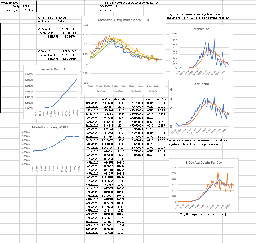 In recent days worldwide cases have been increasing by 1.03 and deaths have been increasing at around 1.03, however; even though some places reported less then 1.01 daily growth, in past recent days some states cases have increased by close to 1.05. Oftentimes, it's around 1.03.
